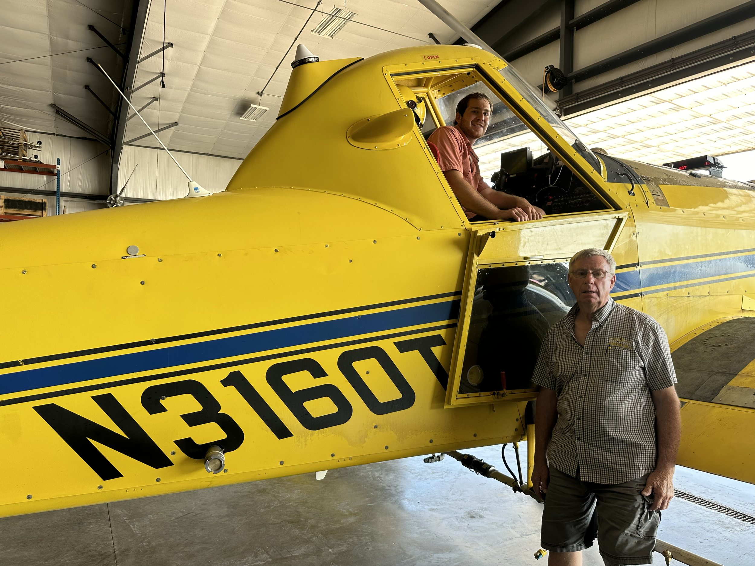 Pictured is Kody Wickert, current owner, with his grandfather, Harley Joe Curless, previous owner. Kody is seated in one of the first air tractors Harley had ever purchased.